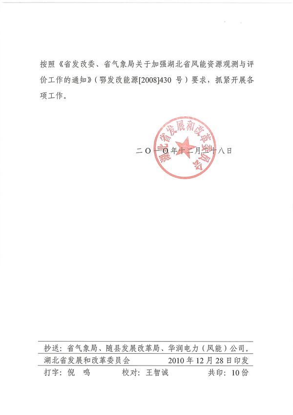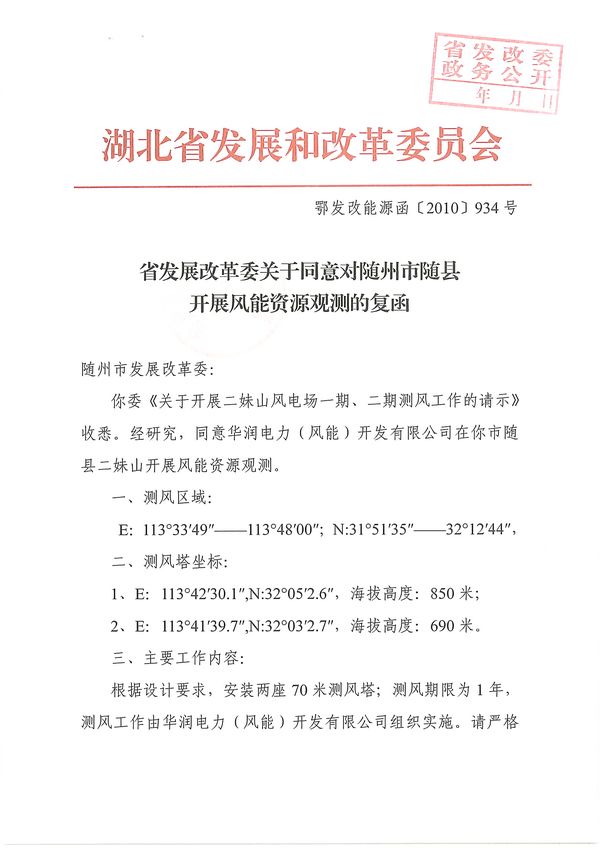 省发改委关于同意对对随州市随县开展风能资源观测的复函