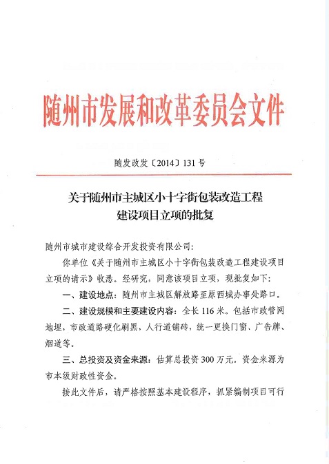 关于随州市主城区小十字街包装改造工程建设项目立项的批复